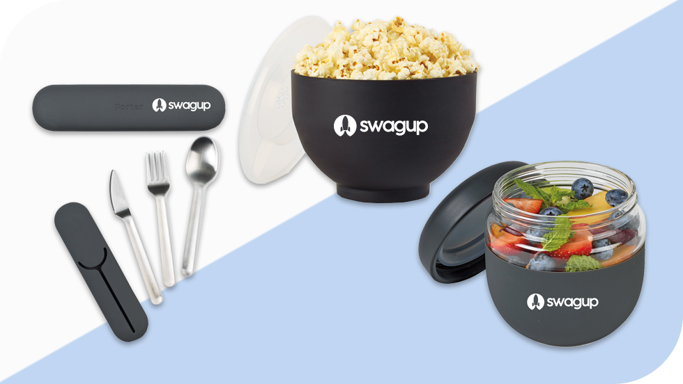 We know — kitchenware?! But while you may have never thought of giving kitchen goods as swag, for people in a new living situation (and honestly also for the ultra-busy), a set of utensils, food containers, and snack bowls could be just the thing to make their workday go better.