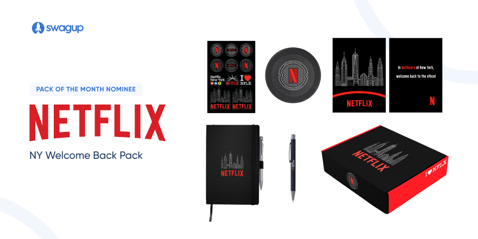 Netflix's NY-themed welcome backpack features fun stickers, a wireless charging pad, and a couple of other office-ready swag picks to help their team make the most of returning to the office.