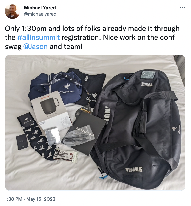 When putting an event together as the cast of All in podcast did, one of the focuses to really set off the event was of course the swag. Why? Well, one would expect with a conference summit filled with top executives from around the world, there would be some sort of value from it. Of course, the content of the event has to be valuable but in order to get people excited and feel the immediate value it is done by giving top-quality swag. Swag for conferences helps create value and build excitement for events which is exactly what the All in podcast swag in the wild did. Our SwagUp team couldn’t capture every swag post there were so many of them getting posted on social media. The swag bags themselves were enough to give you FOMO for not attending the event.
