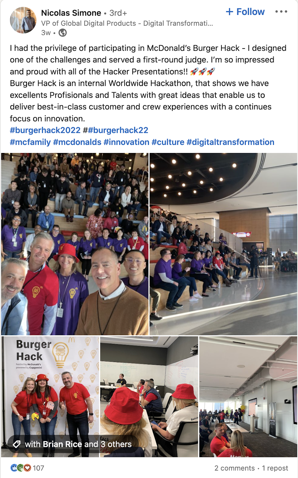 McDonald's strives to innovate. Once a year, they meet with over 500 hackers to help solve the company's most significant problems for their biannual Burger Hack. As cited on their corporate blog,