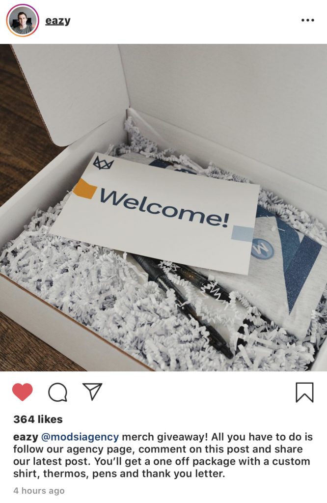 THE DETAILS: The Modsi team expanded their merch to the public, launching with an exciting giveaway of exclusive Modsi Agency swag! Followers received a thank you pack filled with cool items including a branded Modsi shirt, thermos, and thank you note. Shoutout to the team for showcasing their clean and minimalist brand all the way through to the swag đ