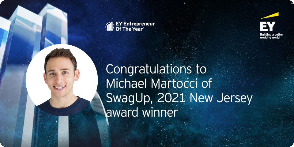 New Jersey, July 26 2021 — Ernst & Young LLP (EY US) today announced that CEO and Founder Michael Martocci of SwagUp was named an Entrepreneur Of The Year ® 2021 New Jersey Award winner. The Entrepreneur Of The Year Awards program is one of the preeminent competitive awards for entrepreneurs and leaders of high- growth companies. The award recognizes those who are unstoppable entrepreneurial leaders, excelling in talent management; degree of difficulty; financial performance; societal impact and building a values-based company; and originality, innovation and future plans. Michael Martocci was selected by an independent panel of judges, and the award was announced during the program’s virtual awards gala on July 26, 2021.