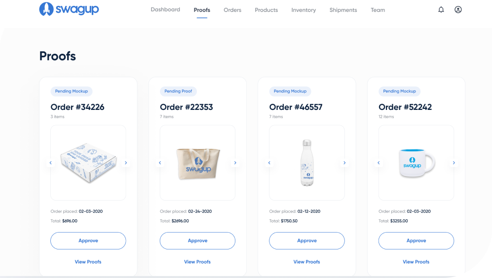 Once your proofs are sent off to production, you can view your “order status” (In Progress, On the Way, Complete) on the Orders page. But the magic doesn’t stop once your order is delivered — if your team really loved the swag, we’ll keep an order history on your SwagUp Platform so you can quickly order again.