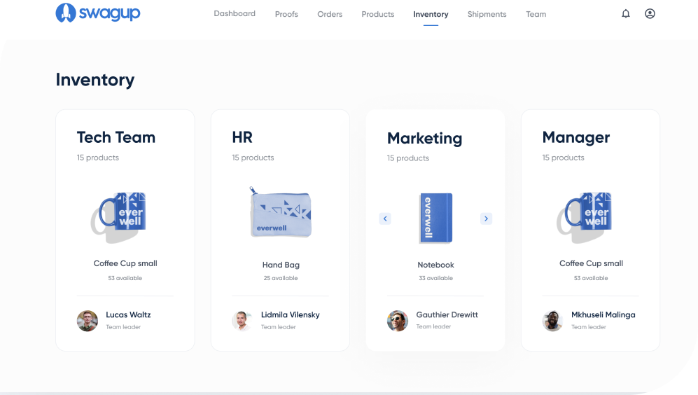 Use your Inventory tab to get real-time inventory updates on all your swag, including 3rd party items! Yup, have extra swag taking up space in your office? Well, what are you waiting for? Send it on over to us, and manage the inventory remotely!