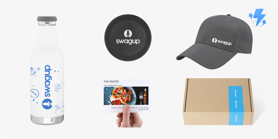 CUSTOM SWAG HIGHLIGHTS: Soda Pop Bottle, Lightweight Performance Cap, Mini Wireless Charging Pad, Super Insert Card, Mailer Box with Custom Tape